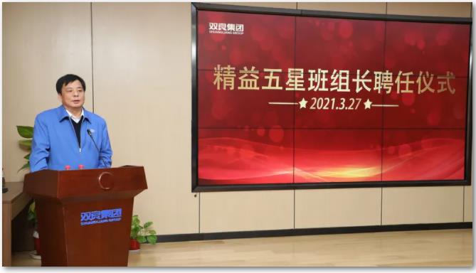 聘任儀式開場(chǎng),雙良集團(tuán)人力資源部總經(jīng)理繆鴻飛宣讀精益五星班組長(zhǎng)的聘任決定。