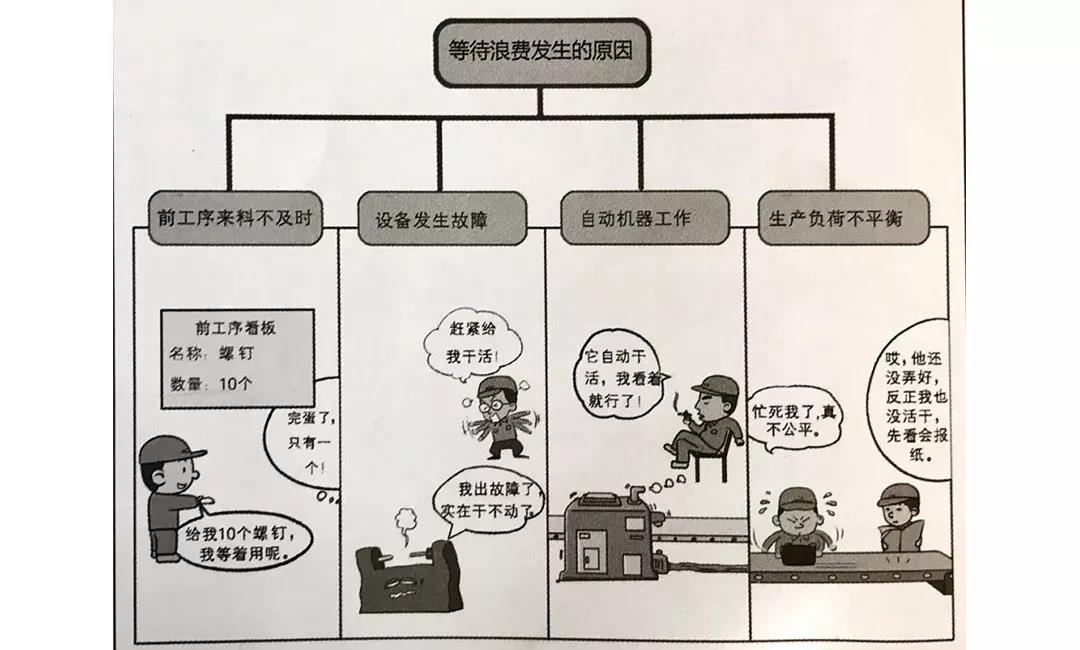 在加工、搬運(yùn)、檢查過程中,隨處可見等待的現(xiàn)象。例如,前工序來料不及時(shí)、設(shè)備發(fā)生故障、自動(dòng)機(jī)器工作、生產(chǎn)負(fù)荷不平衡等,都是等待浪費(fèi)發(fā)生的高危時(shí)段。