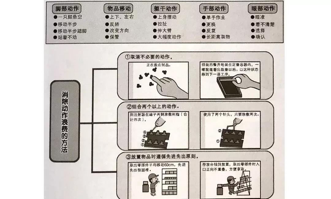 在生產(chǎn)過程中,人和設(shè)備的動(dòng)作中只要不產(chǎn)生附加價(jià)值,都可稱為動(dòng)作浪費(fèi)。例如,單手空閑、作業(yè)動(dòng)作突然停止、作業(yè)動(dòng)作過大、左右手交換、步行過多、轉(zhuǎn)身的角度太大、移動(dòng)中變換“狀態(tài)”、伸背彎腰動(dòng)作以及重復(fù)動(dòng)作等,這些不合理的動(dòng)作造成了時(shí)間和體力上的不必要消耗,都是動(dòng)作浪費(fèi)。消除動(dòng)作浪費(fèi)的三個(gè)主要改善方向?yàn)椋孩偃∠槐匾膭?dòng)作;②組合兩個(gè)以上的動(dòng)作;③放置物品時(shí)遵循先進(jìn)先出原則。