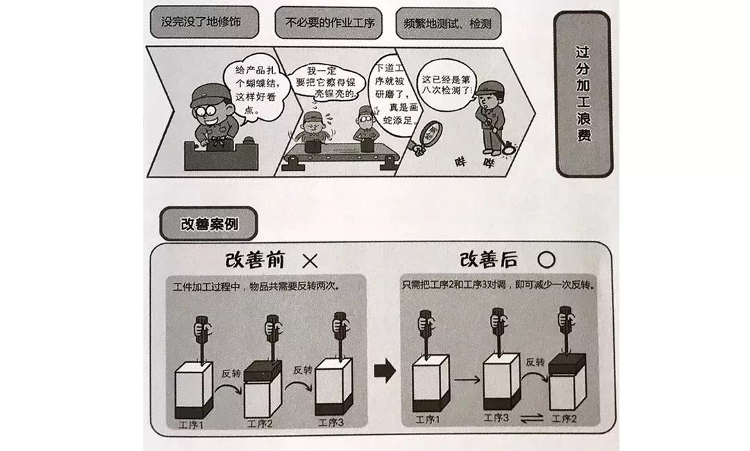 過分加工浪費(fèi)是指加工質(zhì)量或精度超過了下道工序需求或客戶需求而造成的過度加工的浪費(fèi)。例如,沒完沒了地修飾,頻繁地測(cè)試、分類、檢測(cè)。這些白白浪費(fèi)了過多的工時(shí)、原材料和設(shè)備損耗等。在降低過度加工浪費(fèi)的過程中可以對(duì)一些工序可以省略、合并或簡(jiǎn)化等。