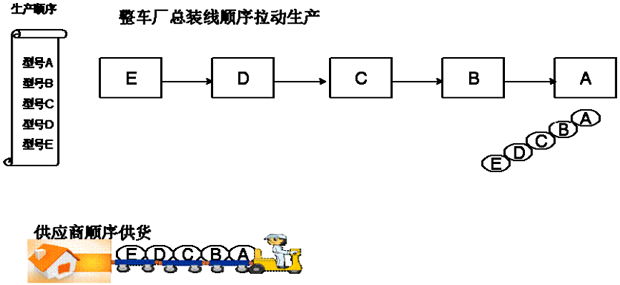 有些部件已不可能通過靠成品庫存的方式來滿足總裝廠的要求,必須做到“順序生產(chǎn),順序供貨”。“順序生產(chǎn),順序供貨”這種模式要求將供應(yīng)單位的零部件生產(chǎn)體系“耦合”到總裝線的整車生產(chǎn)體系中,從而使脆弱的“順序生產(chǎn),順序供貨”得到實現(xiàn)。