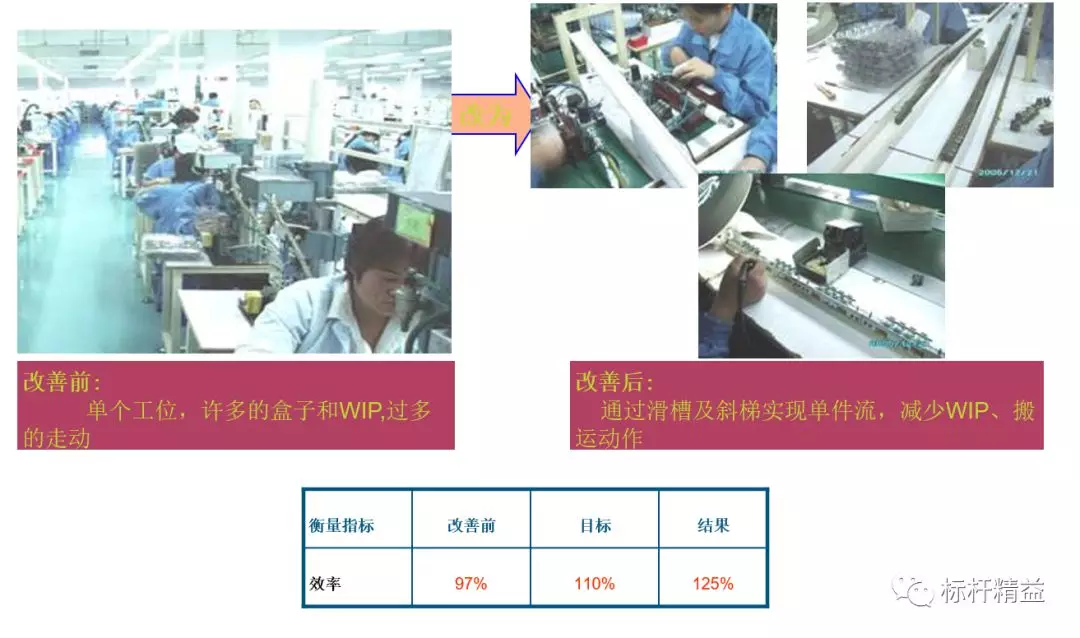 改進(jìn)生產(chǎn)力:許多伴隨批量生產(chǎn)而來的不增值作業(yè)通過單件流也隨即 消除。(如擺盤,搬運(yùn)等)