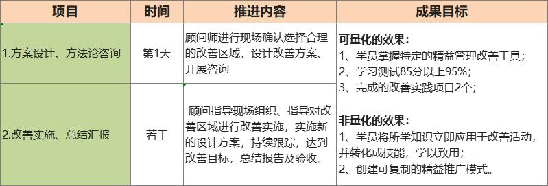 利用咨詢、演練等方法在特定的時(shí)間內(nèi),向特定人員集中講解和訓(xùn)練精益的一種或多鐘適合當(dāng)前企業(yè)需要的方法,也是企業(yè)實(shí)施精益改善的一種兼顧干部能力提升及企業(yè)現(xiàn)實(shí)收益的短平快模式。