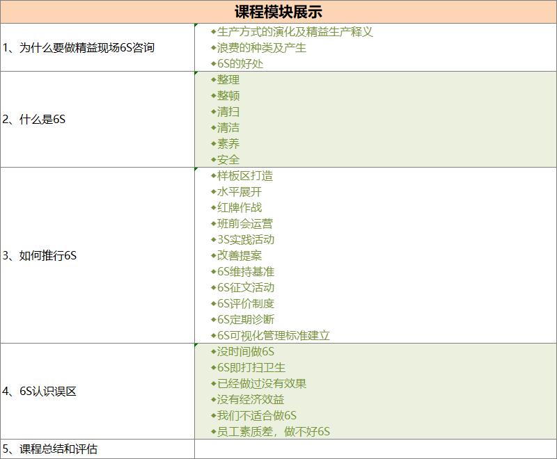本課程在在結(jié)合現(xiàn)場(chǎng)調(diào)研的基礎(chǔ)上,系統(tǒng)地介紹現(xiàn)場(chǎng)6S的理念、方法和工具的同時(shí),重點(diǎn)引入了一個(gè)系統(tǒng)的全景式的沙盤(pán)演練,把抽象的現(xiàn)場(chǎng)6S理念和方法以實(shí)戰(zhàn)的方式模擬出來(lái),包括可視化、定點(diǎn)攝影、班會(huì)運(yùn)營(yíng)等,讓參與者在參與中綜合應(yīng)用和深刻體會(huì)現(xiàn)場(chǎng)6S的理念、方法和工具,并通過(guò)持續(xù)改善清晰的體現(xiàn)現(xiàn)場(chǎng)6S變革帶來(lái)的巨大效益。
