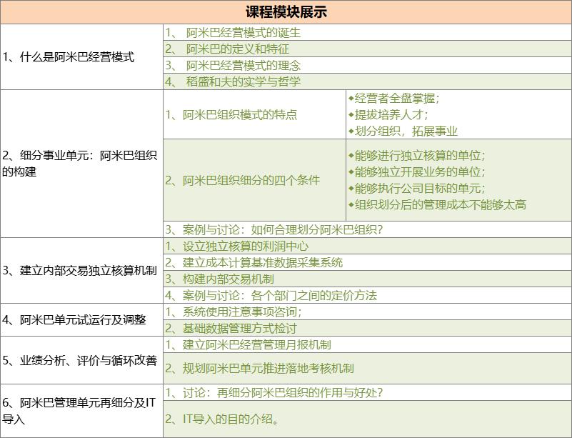 所謂阿米巴經(jīng)營模式就是將整個公司分割成許多個被稱為阿米巴的小型組織,每個小型組織都作為一個獨(dú)立的利潤中心,按照小企業(yè)、小商店的方式進(jìn)行獨(dú)立經(jīng)營。以各個“阿米巴”為核心,自行制訂經(jīng)營計劃,獨(dú)立核算,持續(xù)自主成長,讓每一位員工成為主角,全員參與經(jīng)營。實施阿米巴經(jīng)營模式結(jié)合中國本土文化能很好地將市場競爭壓力傳導(dǎo)給全員,解決員工的動力問題! 本課程在在結(jié)合現(xiàn)場調(diào)研的基礎(chǔ)上,系統(tǒng)地介紹阿米巴管理的理念、方法和工具的同時,系統(tǒng)為企業(yè)構(gòu)建一個樣板阿米巴單元管理體系模型。