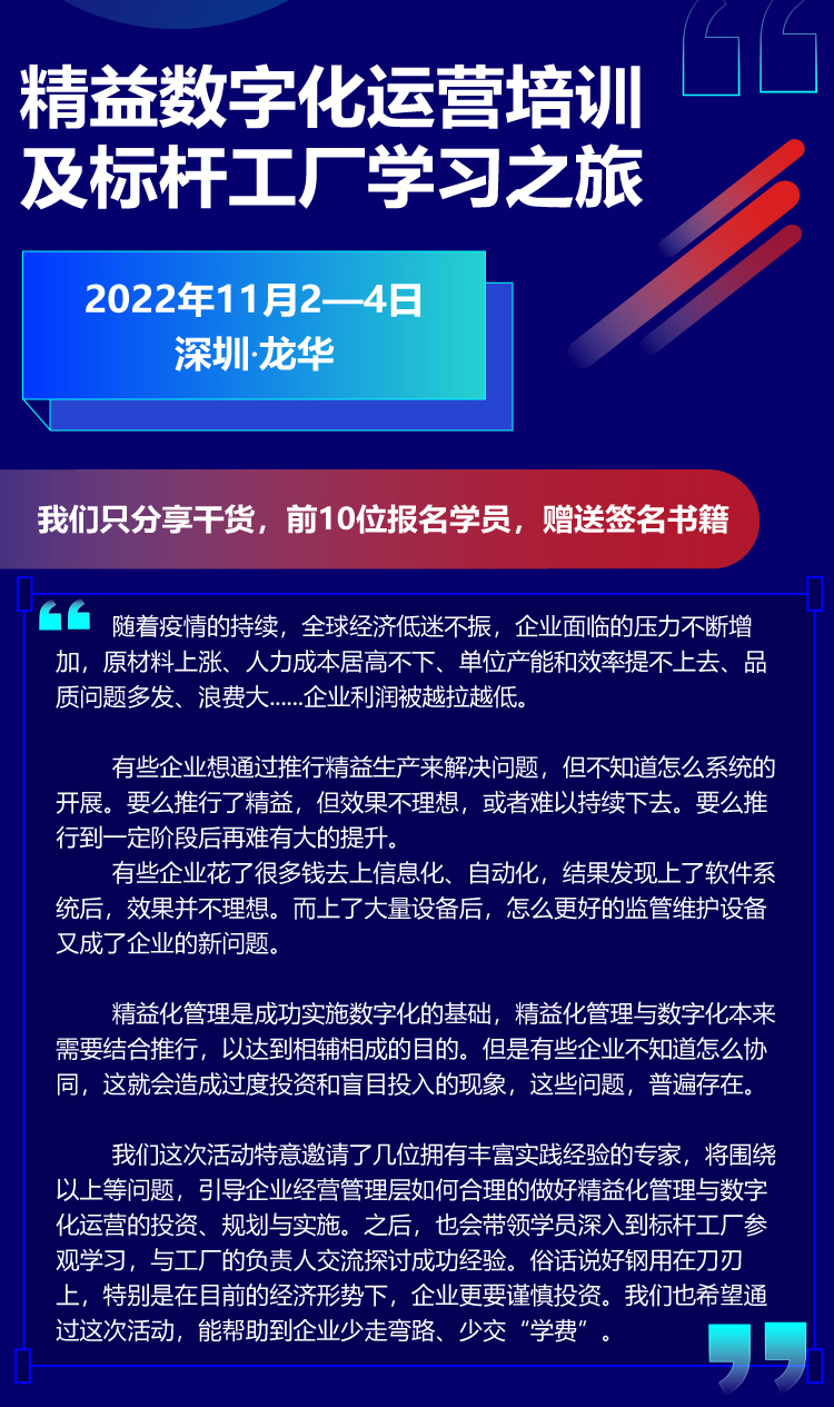 首頁 > 研究與洞見 > 方法論基礎(chǔ) 精益數(shù)字化運(yùn)營培訓(xùn)及標(biāo)桿工廠學(xué)習(xí)之旅火熱報(bào)名中! 來源:華昊企管 發(fā)布時(shí)間:2022-08-29 上一篇:六西格瑪 實(shí)施及推行參考方案 下一篇:工作滿意度:它是什么以及為什么它對專業(yè)人士很重要