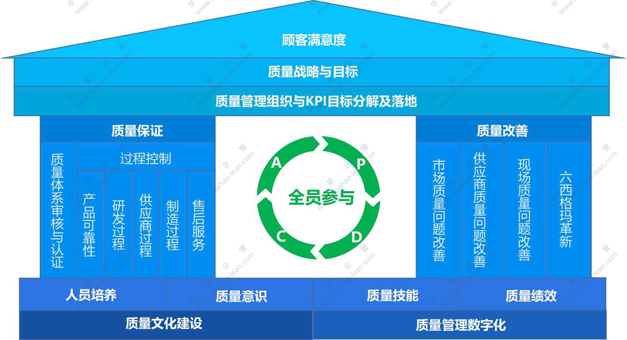 全員品質(zhì)管理,即TQM(Total Quality Management),又稱全面質(zhì)量管理,是指一個(gè)組織以質(zhì)量為中心,以全員參與為基礎(chǔ),目的在于通過顧客滿意和本組織所有成員及社會(huì)收益而達(dá)到長期成功的管理途徑。全面質(zhì)量管理的基本方法可以概況為四句話十八字,即“一個(gè)過程,四個(gè)階段,八個(gè)步驟,數(shù)理統(tǒng)計(jì)方法”。華昊企管全員品質(zhì)管理方法體系,則是在傳統(tǒng)TQM的基礎(chǔ)上,更加強(qiáng)調(diào)SQM(標(biāo)準(zhǔn)品質(zhì)管理 Standard Quality Management)與QCC(品管圈 Quality Control Circles)、六西格瑪?shù)纳罨菩信c創(chuàng)新延展,并與信息化的深度融合及應(yīng)用。